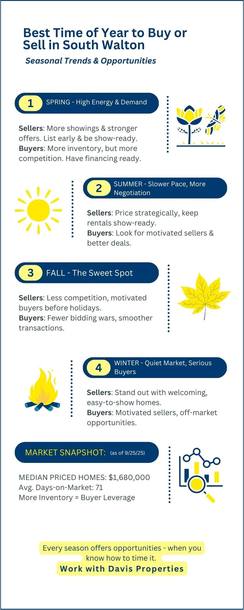 When it comes to buying or selling a home in South Walton, timing can be just as important as price and location. Our coastal market is unique—serving full-time residents, second-home seekers, and investors—and it follows a seasonal rhythm shaped by tourism, weather, and lifestyle. Understanding these patterns helps you make smarter moves and maximize opportunities.