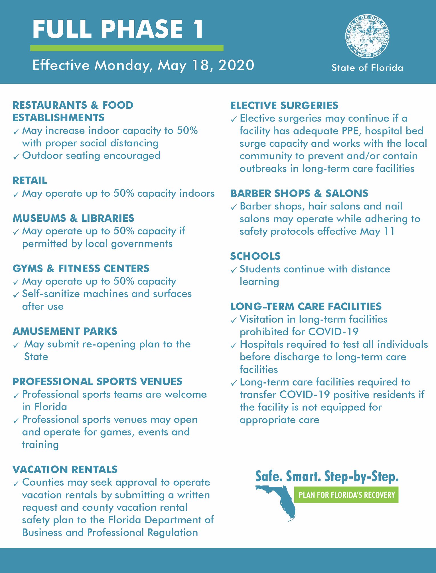 At a public press conference in Jacksonville Florida on Friday afternoon, Governor DeSantis gave an update and announcements on continuing Phase 1 of the of the Safe Smart. Step by Step Recovery Plan to reopen the state. New changes to take place include: