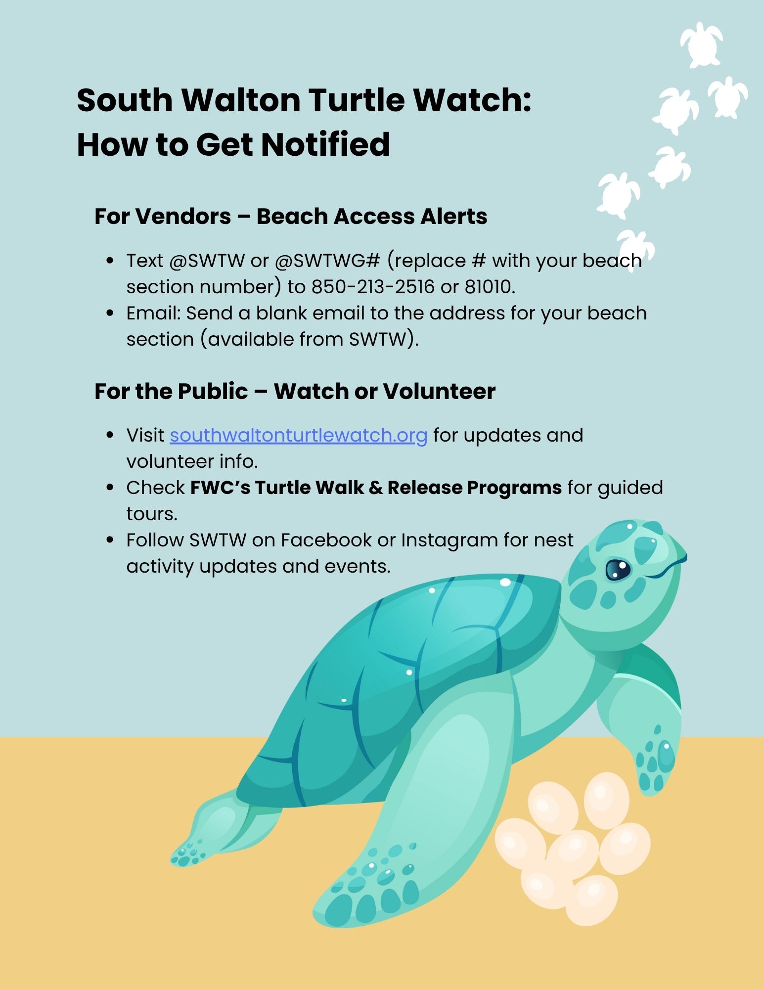 Through the SWTW Beach Access Alert System, vendors get a quick text or email as soon as their section of beach is cleared. The coastline is divided into 18 zones, each with its own alert code, like SWTWG10 for Grayton Beach. Once a section is safe, the system sends out a notification so vendors can set up without disturbing nests or hatchlings.