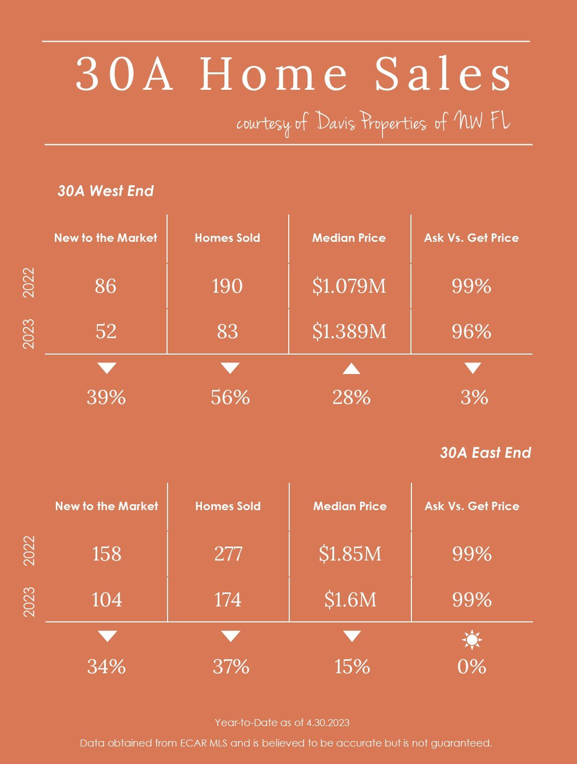 As we look at home prices and trends locally, the following numbers in our infographic below represent single-family homes in two regions of Scenic 30A, from Grayton Beach to the Western End of 30A and from Watercolor to the Eastern End of 30A.