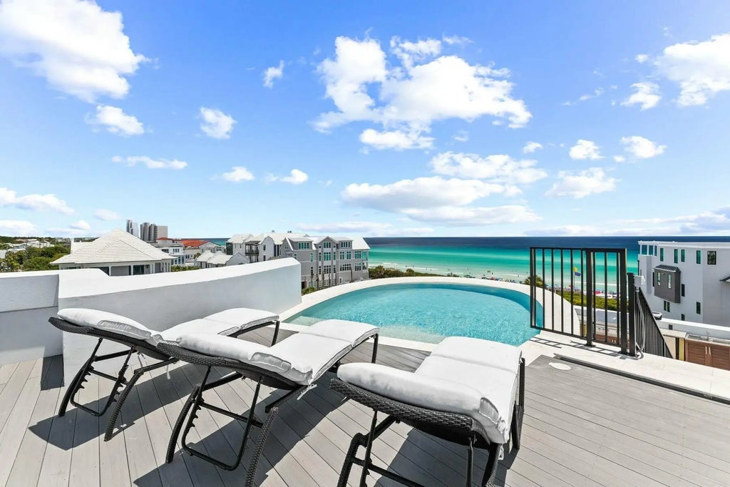 Solid steel-frame and concrete residence in the heart of Seagrove, this five-bedroom, four-bathroom home offers 4,409 square feet of coastal luxury with breathtaking views of the emerald-green Gulf waters. The property features brand-new plumbing, electrical systems, HVAC units, high-impact windows, two new water heaters, and a beautifully redone rooftop Trex deck. New tile and hardwood floors flow throughout the interior, adding warmth and sophistication to every room.The outdoor living spaces are equally impressive, with a newly re-tiled and heated rooftop pool offering panoramic Gulf views, complemented by an outdoor summer kitchen perfect for entertaining. The home sits on newly landscaped grounds, complete with a freshly paved driveway that accommodates parking for fiveBest of all, there's no HOA, giving you freedom and flexibility. Located directly next to public beach access, this property offers unmatched convenience for enjoying Seagrove's pristine white-sand beaches. Inside, the home exudes elegance with Restoration Hardware furnishings and 12-foot ceilings. A wall of southwest-facing windows in the kitchen and living areas fills the space with natural light while showcasing stunning Gulf vistas. This home is a true coastal gem, offering a perfect blend of luxury, comfort, and convenience. Whether hosting family gatherings or enjoying a private retreat, this Seagrove property is your gateway to coastal paradise.