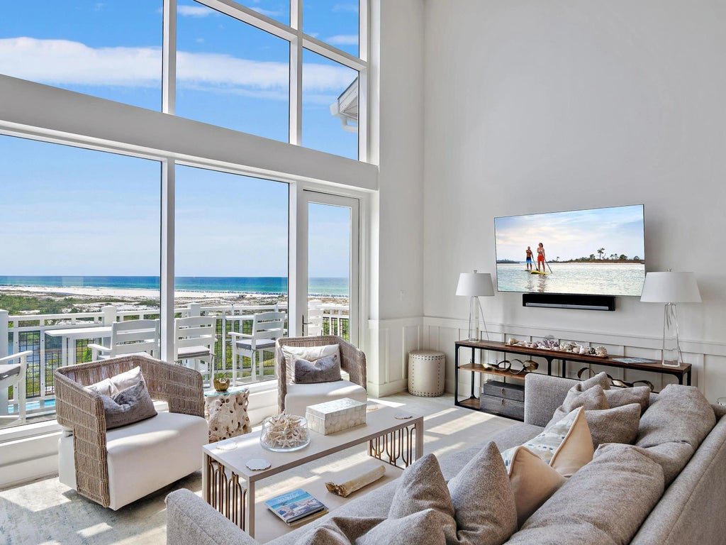 This gulf-facing condo in WaterSound Beach tears up the rule book when it comes to conservative architecture. From soaring windows framing gulf and lake views to a bonus living space in the mezzanine loft, this luxury retreat is all about the view. Sitting high above the dune lakes, this residence has a light, bright living space with 20-ft. ceilings and stunning two-story-high windows framing incredible coastal views from the sitting area, dining room and the newly revamped kitchen. If you want to feel the breeze, just step outside onto the balcony and breathe in the fresh sea air. Fully renovated to the highest standard, it has new custom lighting and fresh paint, creating a cool coastal feel. Three new HVAC units ensure comfort and efficiency. There's a guest bedroom on the main floor,along with a newly updated bathroom, which has a tiled shower. The stunning chef's kitchen showcases new cabinetry topped with gorgeous quartz countertops. High-end appliances include a Viking refrigerator, range, and Bosch dishwasher, minimizing time spent on kitchen duty. A cool bar offers a perfect space to hang out over a glass of wine while making plans for the evening. It supplements the spacious dining table, which seats an additional six diners. Ascend a flight of stairs to the mezzanine level, which is furnished with a sleeper sofa and TV. It's the perfect bonus space for watching TV or accommodating additional overnight guests. The half-height rail offers expansive open views of the sitting room below and the stunning coastal views. Hardwood stairs also lead down to the lower floor, where there's a guest bedroom with a beautifully updated bathroom featuring a walk-in shower. Beyond the laundry room, the tastefully appointed primary suite is a peaceful retreat with its own sitting area. The adjoining bathroom has been completely re-imagined to include a seated vanity, a fully tiled walk-in shower and a freestanding oval tub. This oversize master suite also has its own private balcony, providing the perfect hideaway for reading or sipping coffee before the day begins. With a proven rental history, this fully furnished property is ready to enjoy as a smart investment property, a vacation retreat, or your full-time coastal home. This outstanding Compass Point II residence includes a detached garage for storing golf carts, beach chairs and bicycles. WaterSound residents and guests have access to a host of enviable amenities, including golf, community pools, tennis and pickleball courts, a wellness center, dining, boutique shopping, and a private beach.